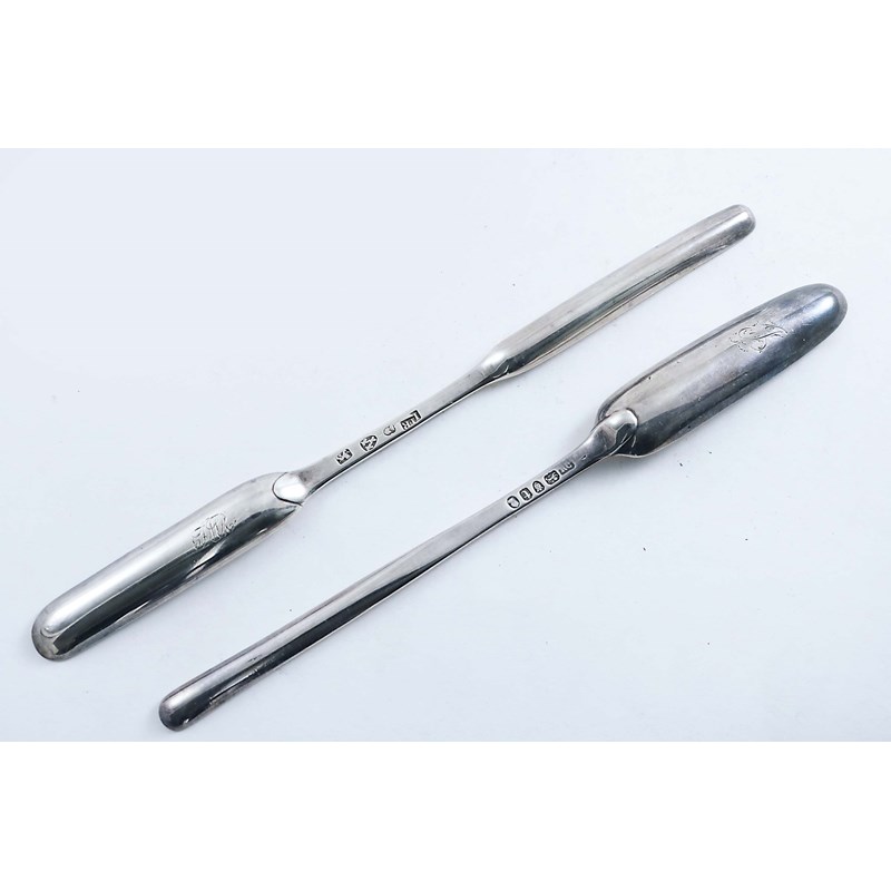 initialled, by John Robertson, Newcastle c.1800 (no date letter) and a George III London-made marrow scoop, initialled, by Richard Crossley 1794; the latter 8.9" (22.5 cms) long; ` (2)