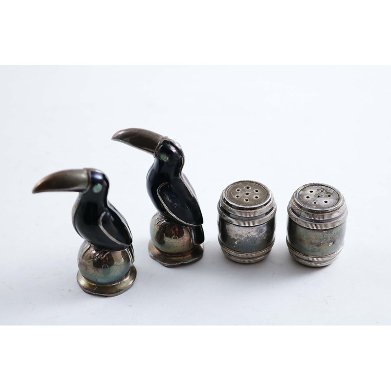 A PAIR OF MID/LATE 20TH CENTURY DANISH ENAMELLED NOVELTY PEPPERETTES, each modelled as a toucan on a globe (one lacking its filler cap), signed "MEKA", and a pair of French electroplated pepperettes, signed "GALLIA"' the toucans 2.25" (5.7 cms) high; 1.5 oz weighable silver (4)