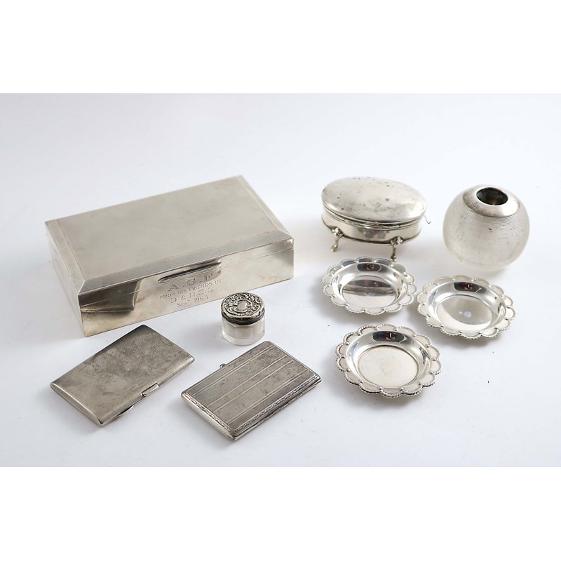 A cigarette box, with a small inscription on the front, (woodlined), two cigarette cases, four small Mexican pin dishes, an oval dressing table box on four legs (silk lined), a mounted glass vesta ball and a small mounted glass box; the cigarette box 6.3" (16 cms) long; 8 oz weighable silver (10)