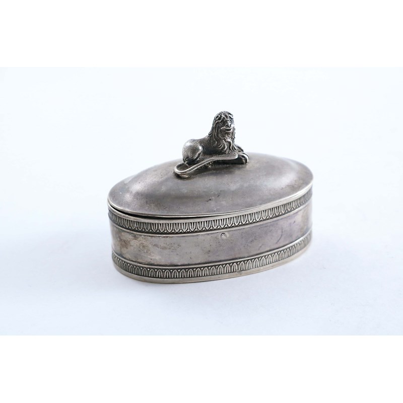 with a lift-off domed cover and a recumbent lion finial, the box with an upper and lower border repeating tongue and dart motifs, no maker's mark, town mark only (struck twice), Florence 1800-1820; 3.25" (8.2 cms) long; 4.2 oz