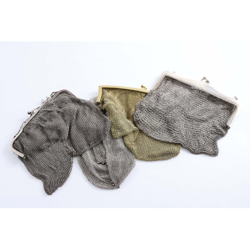 inscribed "Hilda Wallis, Dorney Court, Shanklyn", a mesh pouch, a silvergilt mesh bag, hallmarked Birmingham 1912 and another with import marks for London 1919; the largest one 6" (15 cms) wide; 19 oz weighable silver (4)
