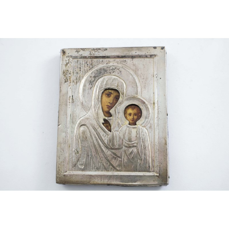 AN EARLY 20TH CENTURY RUSSIAN SMALL ICON with a small title or inscription along the base (in Cyrillic), struck only with a state mark for 1908-1917; 4.25" (11 cms) high