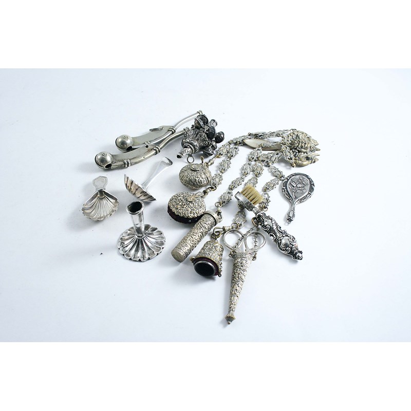 TWO PLATED BOSUN'S WHISTLES a rattle and a chatelaine, a caddy spoon 1806, another Chester 1908 and three small silver items viz. a hand mirror, brush & taperstick, Birmingham c.1900 (9)