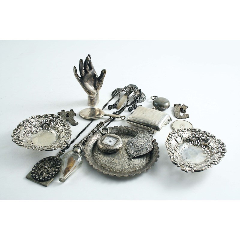 including a pair of pierced dishes, Birmingham 1895, a sovereign case, Birmingham 1900 and six plated items including a chatelaine and a hand ring stand (13)