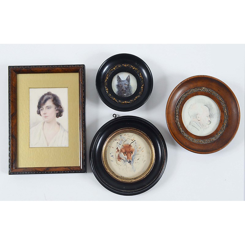 ENGLISH SCHOOL Miniature portrait of a terrier, on ivory; 4.5 cms diameter, signed with monogram (F.G.Y?), portrait of a fox, on card, signed with monogram (JH?) and dated 1917 and two other portraits (4)