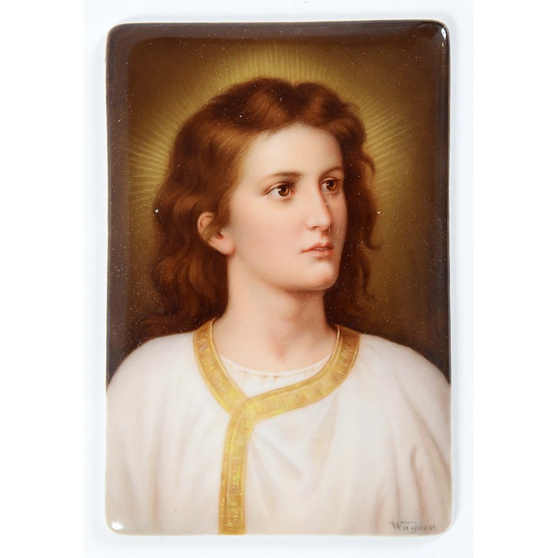 A GERMAN PORCELAIN PLAQUE painted with a portrait of Jesus, head and shoulders, signed Wagner, late 19th century; 15 x 10 cms