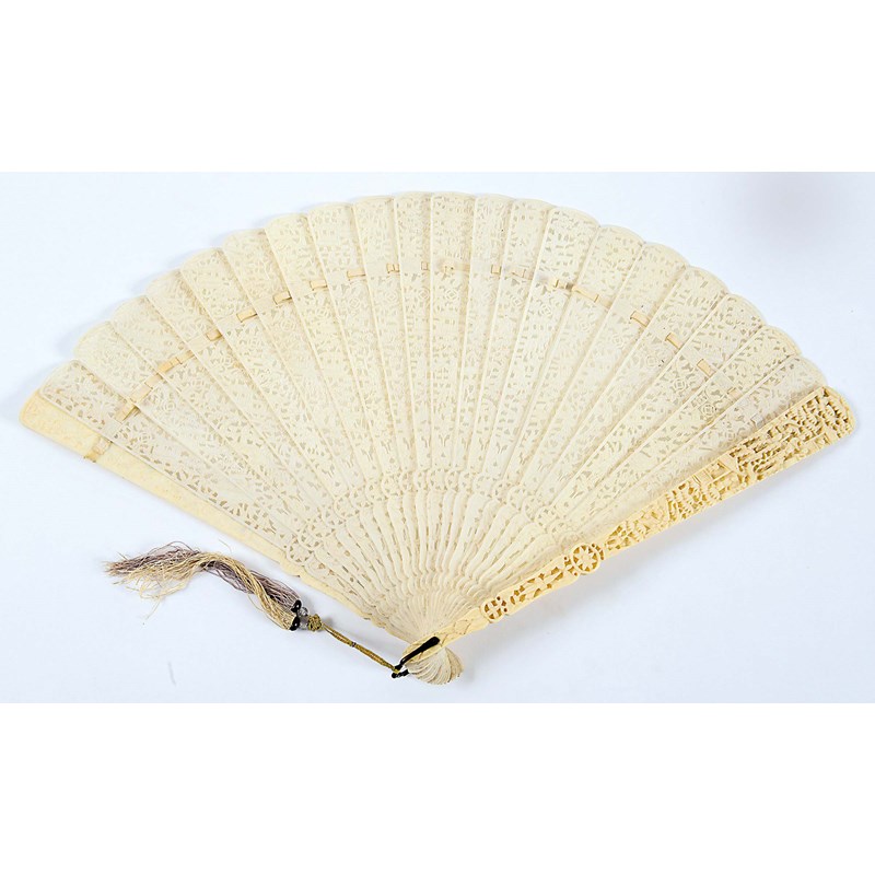 A CHINESE CARVED IVORY AND BRISE FAN guards and sticks carved with figures among buildings, 19th century; 27.5 cms