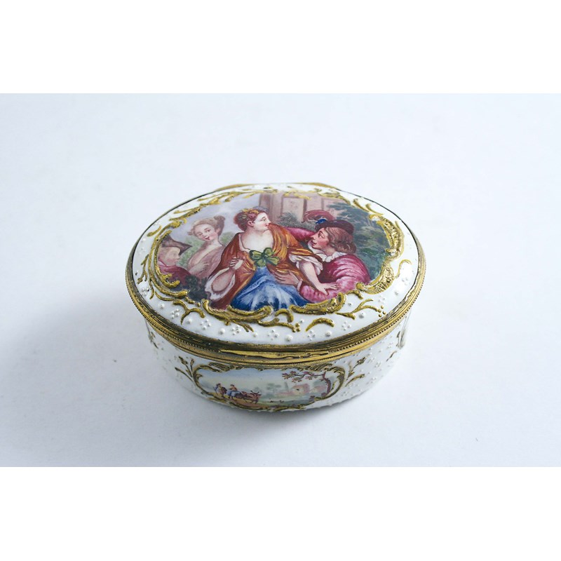 A STAFFORDSHIRE ENAMEL SNUFF BOX oval white, the cover painted with lovers, the sides with rural vignettes