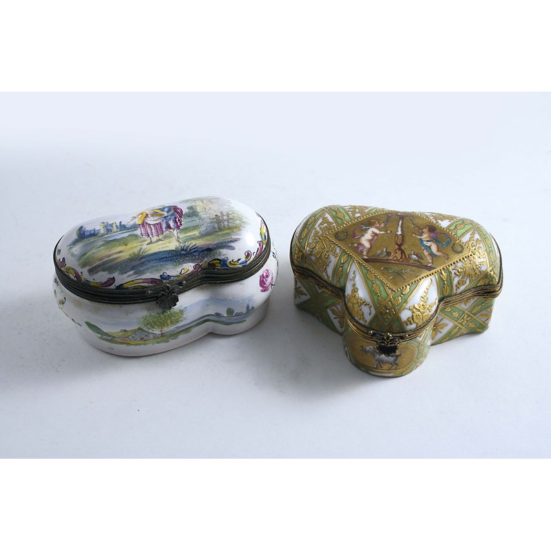TWO FRENCH PORCELAIN SNUFF BOXES One painted with putti within green and gold bands and flowers inside, 9 cms; the other with rural scenes, c.1900