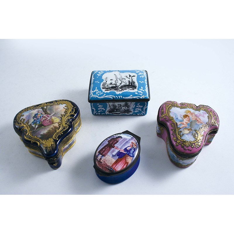 A STAFFORDSHIRE ENAMEL SNUFF BOX pale blue with reserves en grisaille," a box inscribed "A New Love Song...etc" and two French porcelain boxes (4)