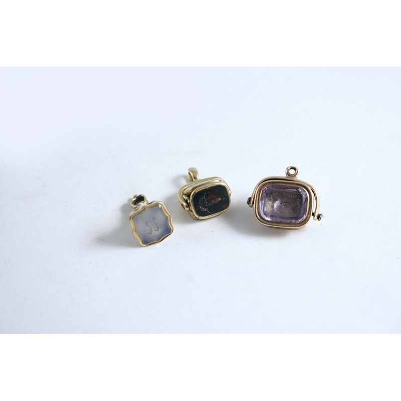set with a foiled stone engraved with the all seeing eye and "Ouil Veille Sur Vous", 2 cms, a three sided swivel seal and another small seal (3)