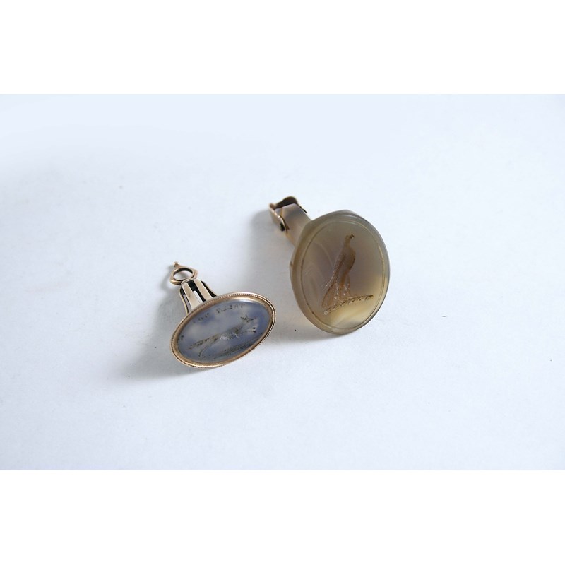 A REGENCY FACETED AGATE SEAL oval intaglio, engraved with crest of a hawk, 4 cms and a gold mounted seal with stone engraved with a fox and "Tally Ho"