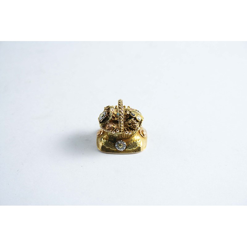 A THREE COLOUR GOLD AND GEM SET SEAL in the form of a basket of flowers, cornelian intaglio, engraved "Hurry up"; 2 cms