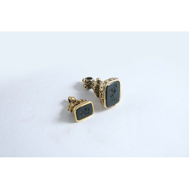 A 19TH CENTURY GOLD SEAL The bloodstone intaglio engraved with crest of a live bird, 3 cms and a small seal with stone engraved with a vulture attacking a rabbit (2)
