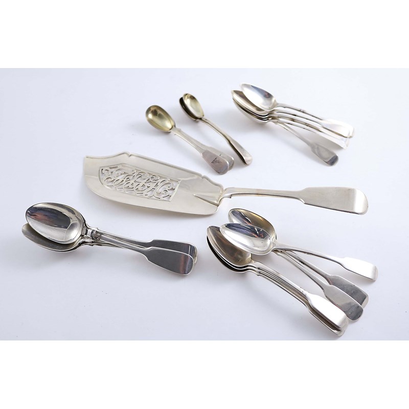 A Victorian fish slice, four Victorian dessert spoons, a set of twelve George III tea spoons & a set of four George III egg spoons with gilt bowls, crested; 18.5 oz (21)
