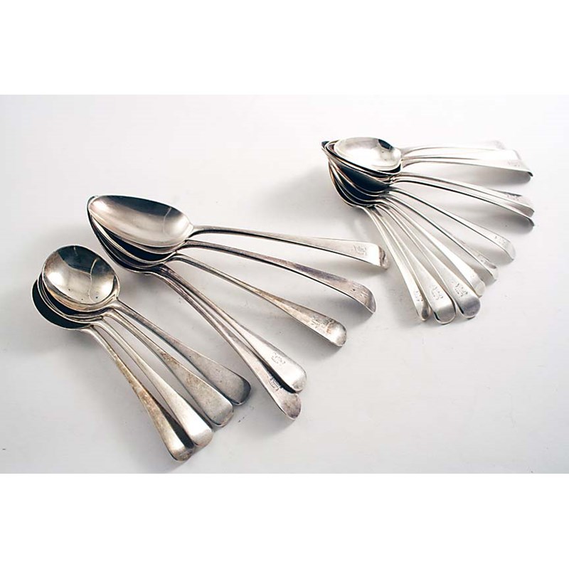 ELEVEN VARIOUS GEORGE III OLD ENGLISH PATTERN DESSERT SPOONS