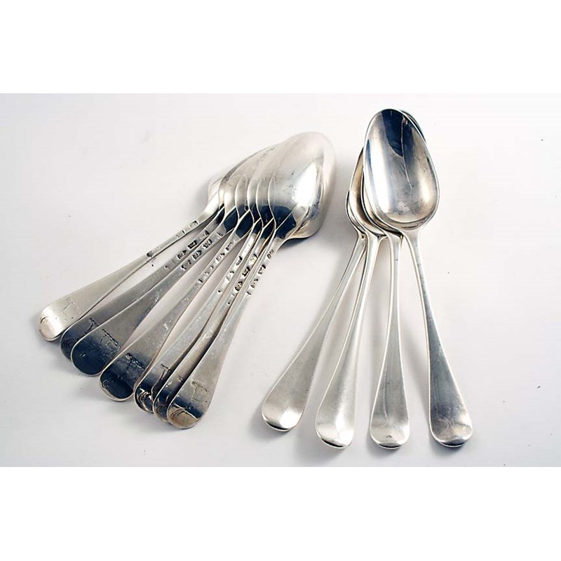 A SET OF ELEVEN GEORGE II HANOVERIAN PATTERN TABLE SPOONS crested, by Elias Cachart, London 1749; 25.1 oz (11)