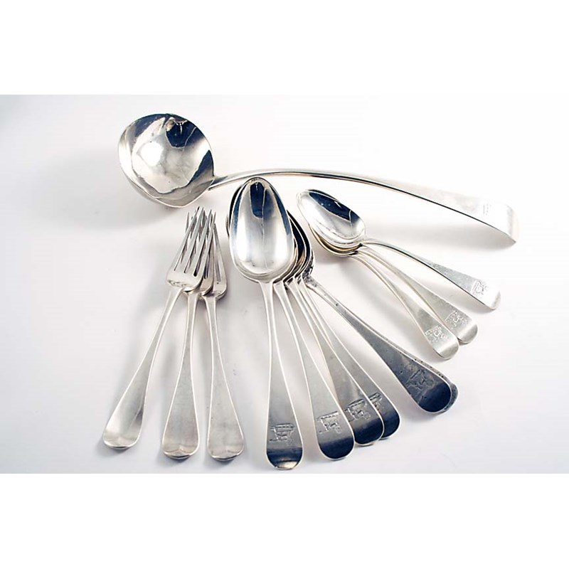 A set of six table spoons and three table forks, by Barber, Cattles and North, York 1825, a soup ladle by J. Barber & W. Whitewell, York 1818 and a set of three dessert spoons by J. Barber & Co., York 1821; 33.2 oz (13)