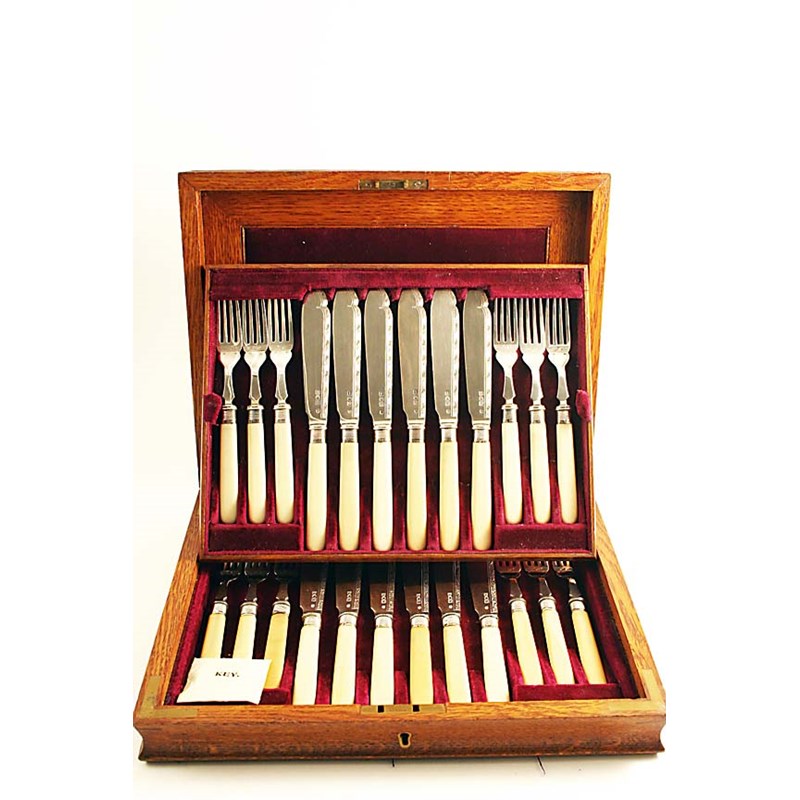 AN EDWARDIAN CASED SET OF TWELVE PAIRS OF IVORY HANDLED FISH KNIVES & FORKS with border engraving on the blades & tines, by William Hutton & Sons Ltd., London 1906; the case 12.6" (32 cms) long