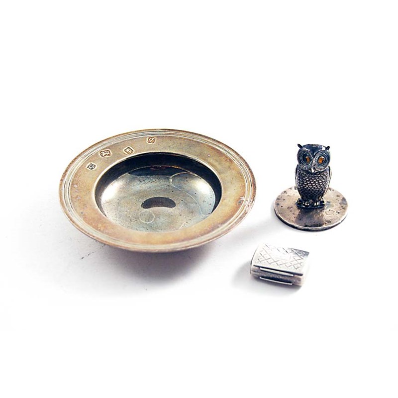 initialled, grille hinge A/F, a small "Armada" dish, an owl menu card holder by S. Mordan & Co., Chester 1905; the latter 1.3" (3.2 cms) high; 2.4 oz (3)