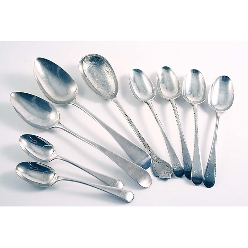A set of three George III Feather-edge dessert spoons, initialled "B", by Paul Callard, London 1766, another Feather-edge dessert spoon, also initialled "B", two table spoons, two tea spoons, initialled "R" and an engraved fruit serving spoon; 10.8 oz (9)