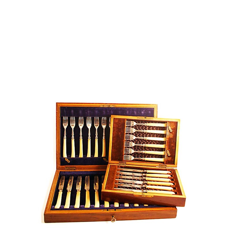 A COLLECTED OR MATCHED SET OF TWELVE PAIRS OF DESSERT KNIVES & FORKS with engraving and ivory pistol handles and another similar matched set of six pairs of dessert knives and forks, all by two makers (J & W. Deakin and James Dixon & Sons), Sheffield, mixed dates 1892-1931, each set boxed (2)