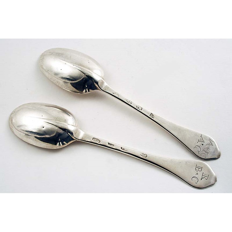 with a plain moulded rattail & the scratched initials "R" over "B&C", maker's mark partially unclear, London 1709 and another Dognose spoon, pricked "AK" over "AC", London 1710 (maker's mark unclear); the latter 7.75" (19.6 cms) long; 3.25 oz (2)