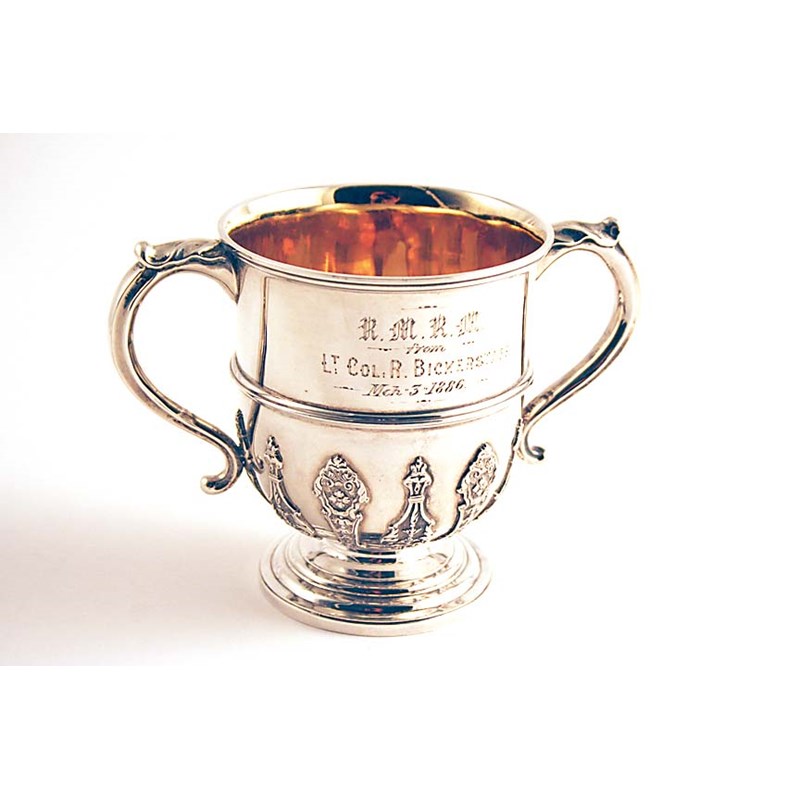with applied decorative straps around the lower body, gilt interior & a small inscription on one side by Charles Stuart Harris, London 1885 (original fitted case); 4.1" (10.2 cms) high; 8.1 oz