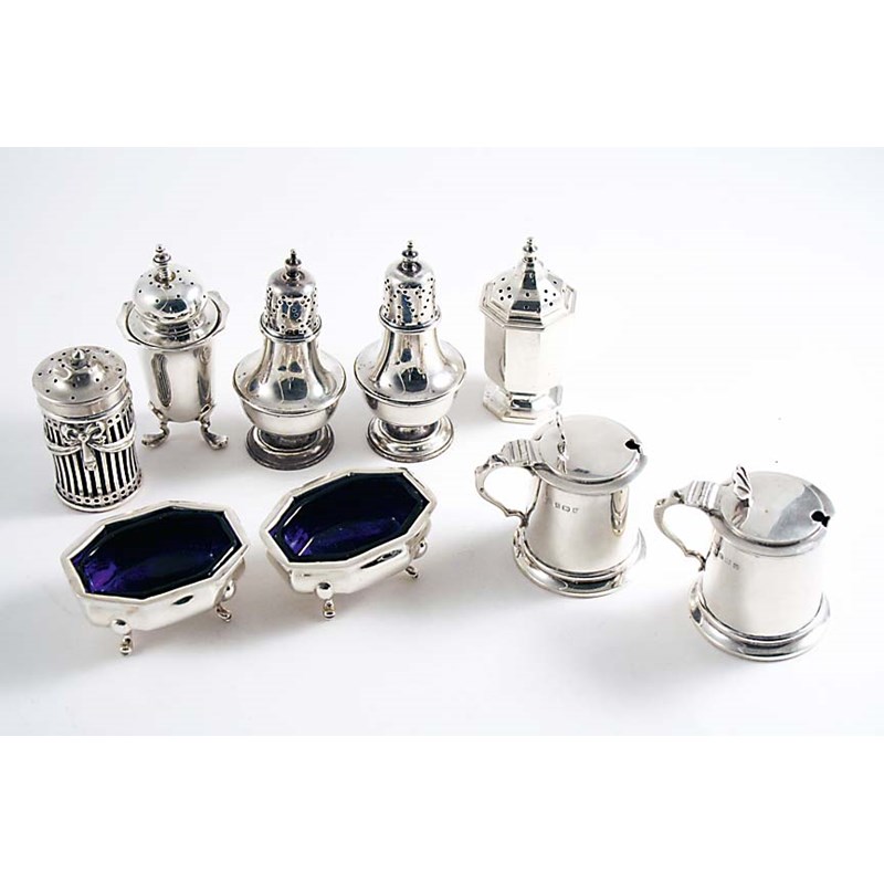 each resembling a tankard, by Mappin & Webb, Birmingham 1925 (blue glass liners) and seven other various condiments; the mustards 2.5" (6 cms) high; 9.2 oz weighable silver (9)