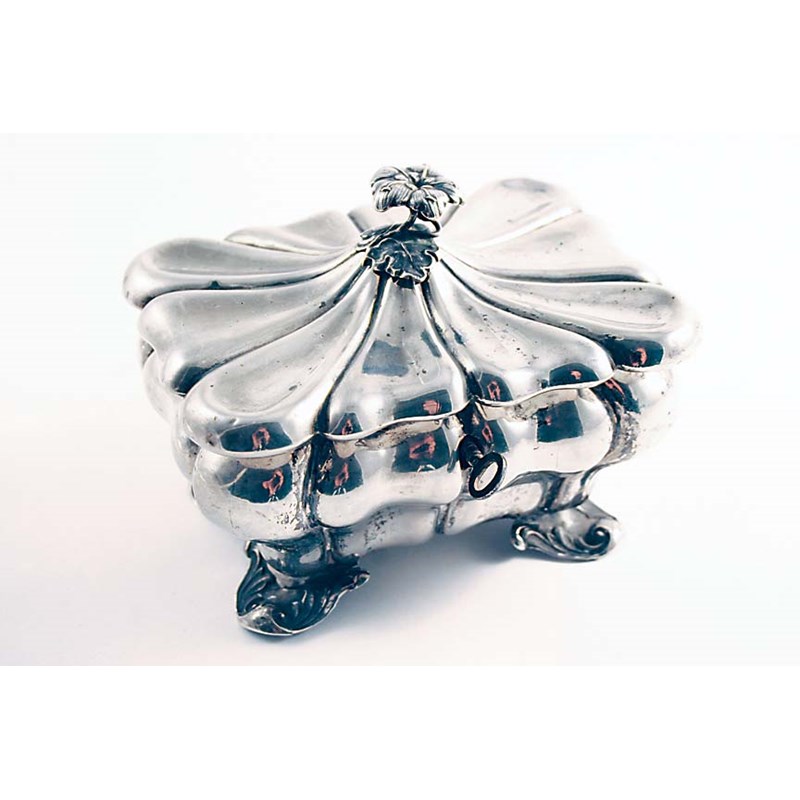 of rounded rectangular form with lobed and fluted decoration, scroll feet and a flower finial, gilt interior, complete with lock and key, struck with two marks "13" and "0", probably Austro-Hungarian 1825-1850; 5.5" (14 cms) long; 6.9 oz