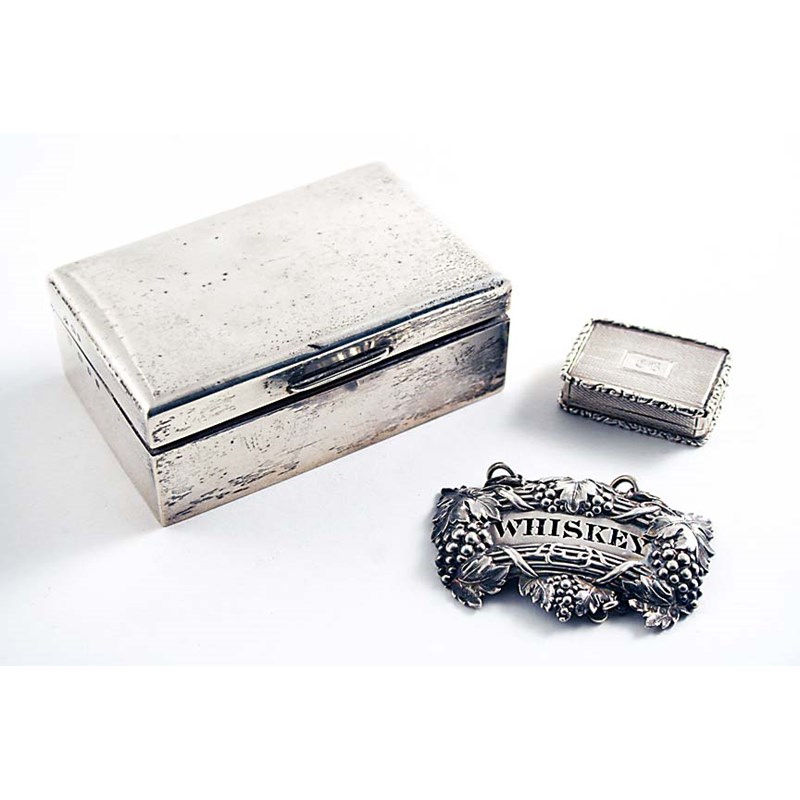 with wood lining, by Richard Comyns, London 1930, a "WHISKY" label by Messrs. Barnard, London 1829 and a vinaigrette, initialled "E.B" by John Bettridge, Birmingham 1826; the latter 1.45" (3.2 cms) long; 1.45 oz weighable silver 93)