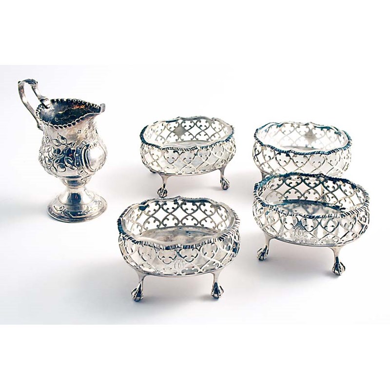 oval with ball & claw feet and pierced sides, initialled "CC", by Robert & David Hennell, London 1766 (three with glass liners) and a George III embossed cream jug, maker's mark partially unclear, London 1775; the latter 4.1" (10.5 cms) high; 14.25 oz weighable silver (5)