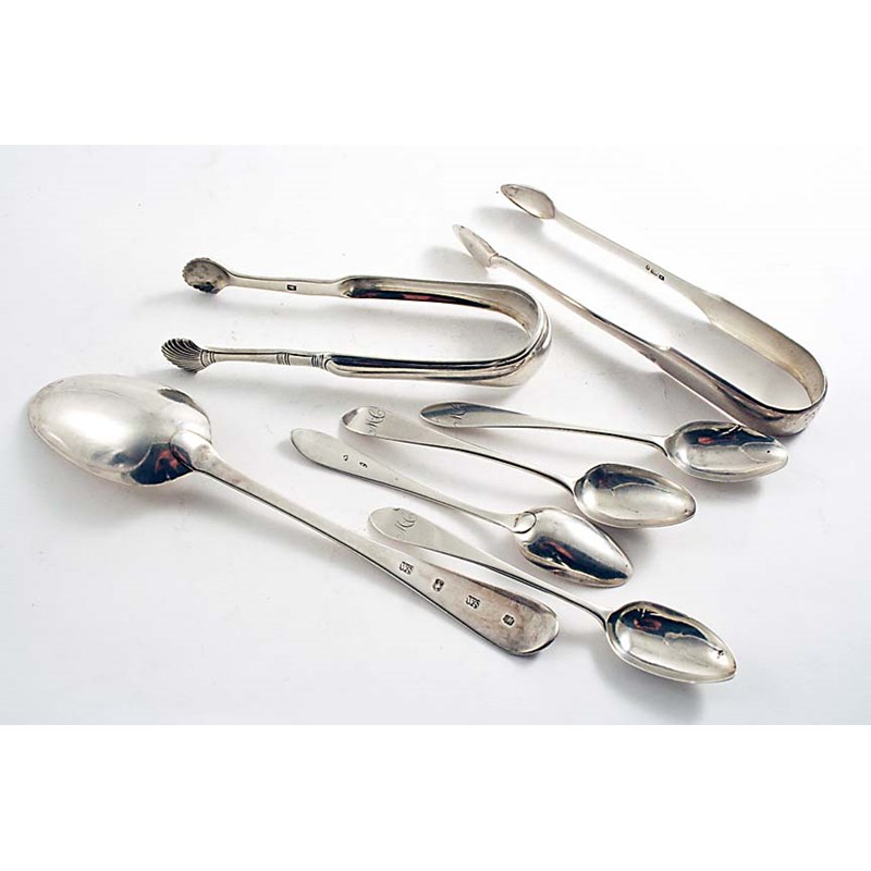 A table spoon, initialled, by William Scott of Dundee c.1780, a pair of sugar tongs, initialled, by John Glenny of Montrose 1820-30 and a set of four tea spoons, initialled by James Douglas of Dundee 1800-1810; 6.95 oz (7)