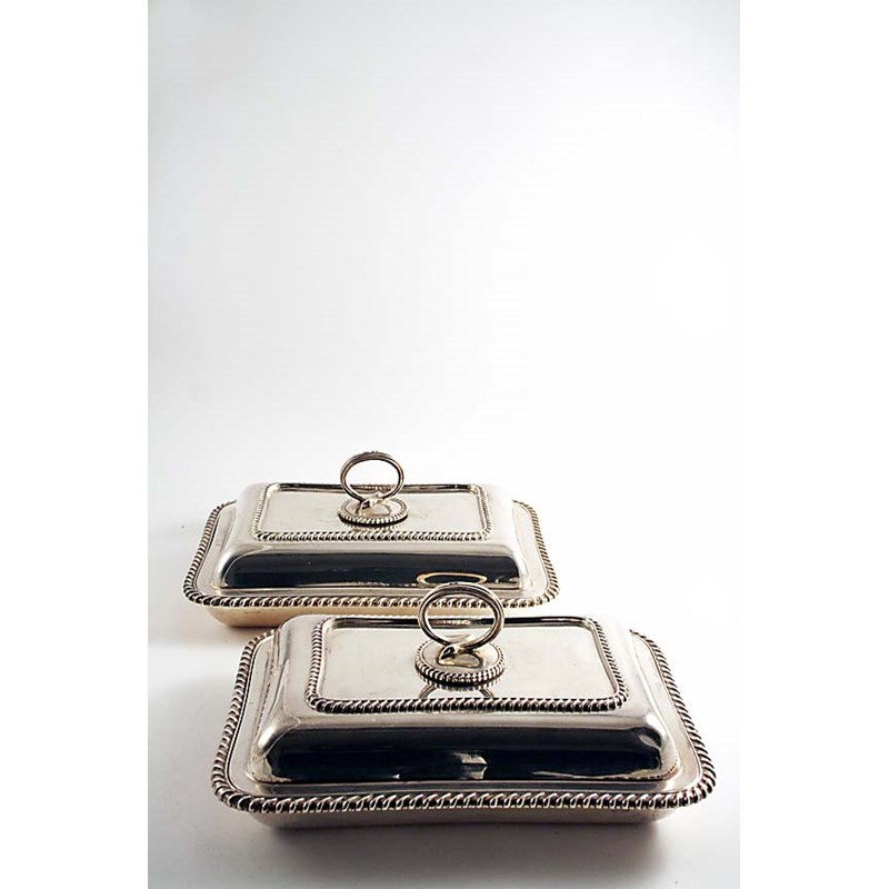 A MATCHED PAIR OF EARLY 20TH CENTURY RECTANGULAR ENTREE DISHES & COVERS with gadrooned borders and detachable ring handles, crested, by the Goldsmiths & Silversmiths Co.Ltd., Sheffield and London 1921/28; 11.2" (28.5 cms) long; 102.25 oz (2)