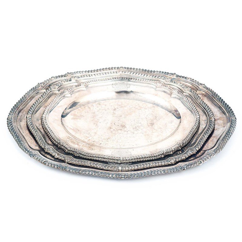 of shaped oval outline with gadrooned borders, interspersed with anthemion-like motifs, each dish engraved twice on the edge with a coat of arms, all by John Bridge, London 1831; the dishes measuring:-