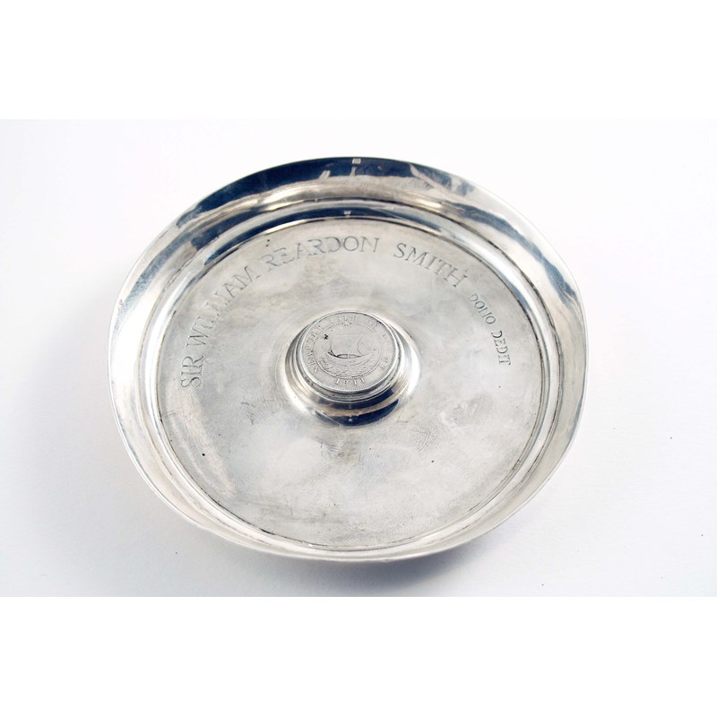 An early 20th century small plain circular dish or ashtray with a raised central boss, set with a Newport Isle of Wight "one shilling" trade token (dated 1811), inscribed around the centre "SIR WILLIAM REARDON SMITH DONO DEDIT", hallmarked London 1933 and struck also with Murphy's Falcon Studio mark; 5" (12.5 cms) diameter; 4.1 oz