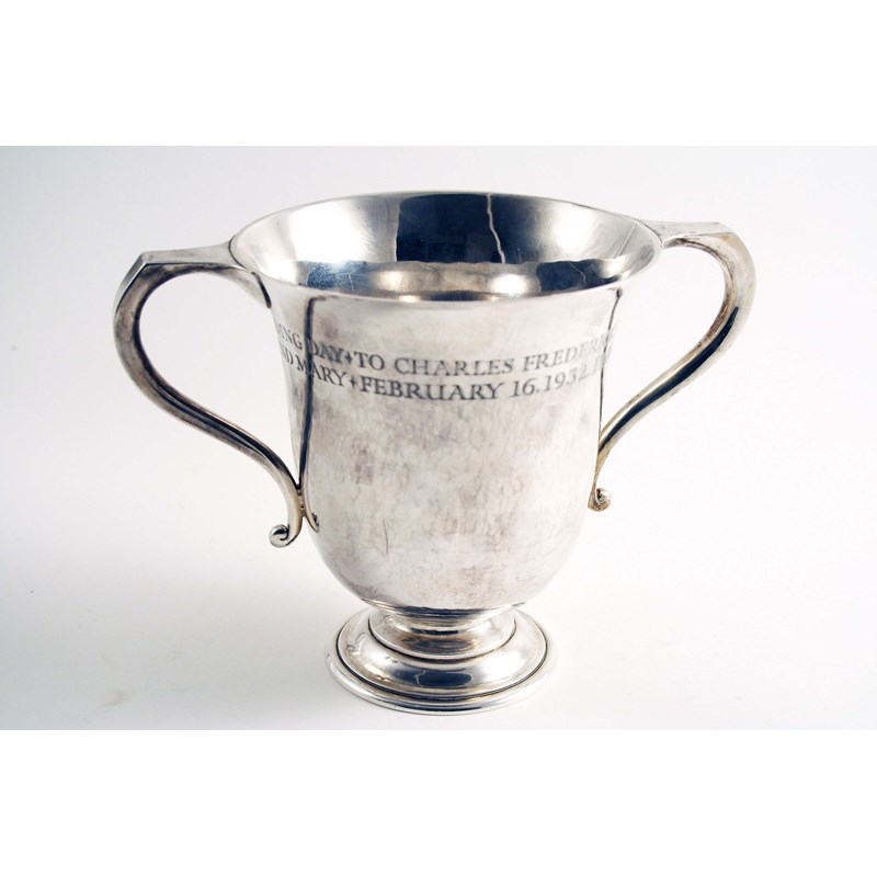 An early 20th century handmade loving cup with twin scroll handles, a campana-shaped bowl and a spreading, domed foot, inscribed around the upper body "To Charles Frederick and Henrietta Maria Fox on their Golding Wedding day from their children Cyril, Norma, Dorothy and Mary February 16.1932", hallmarked London 1931 and struck also with Murphy's Falcon Studio mark; 5.5" (14 cms) high; 14.1 oz