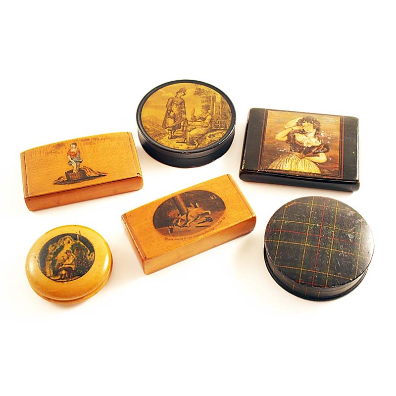 with two tethered terriers terriers trying to catch a rat "Theres many a slip between the Cup and the Lip", another with a washer woman, a small circular example, a circular Tartanware snuff box "McKenzie", a lacquered circular box with a print depicting a lady making butter as a traveller passes by, and a painted rectangular snuff box with a print of a dancing girl on the cover; the latter 3.4" (8.5 cms) long (6)