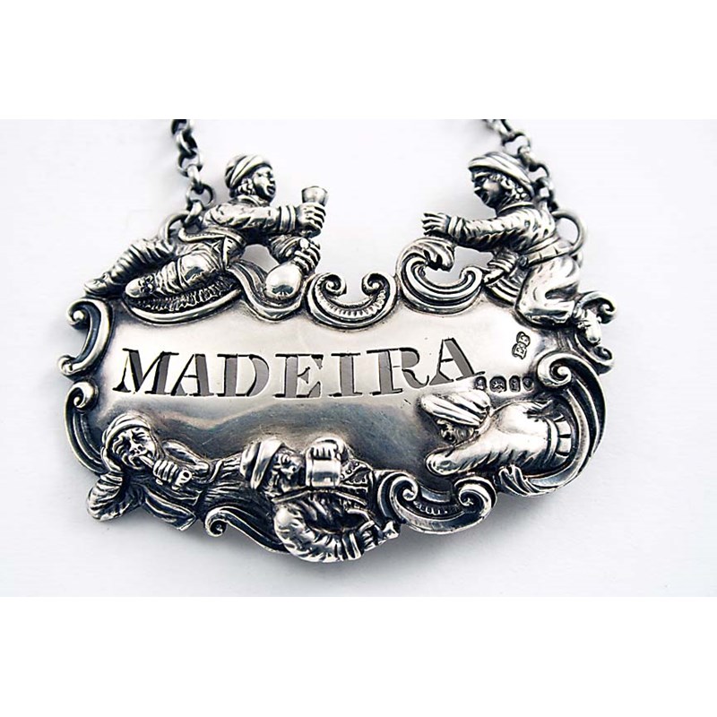 A GEORGE IV CAST "JOLLY TOPERS" WINE LABEL of shaped outline with a border of scrolls and five carousing individuals in high relief, pierced "MADEIRA", by Edward Farrell, London 1824; 3" (8 cms) long; 1.75 oz