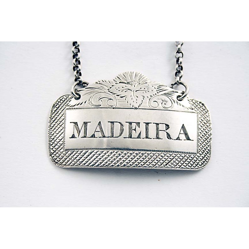 A WILLIAM IV ENGRAVED RECTANGULAR WINE LABEL with a hatched border and a foliate scroll surmount, incised "MADEIRA", by Thomas Edwards, London 1836; 2.1" (5.4 cms) long; 0.4 oz