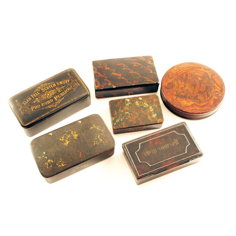 including a circular example with a printed scene of merriment, another "CLAN FELL SCOTCH SNUFF" with the maker's name inside the cover and another "HELP YOURSELF"; the largest one 3.75" (9.5 cms) long (6)