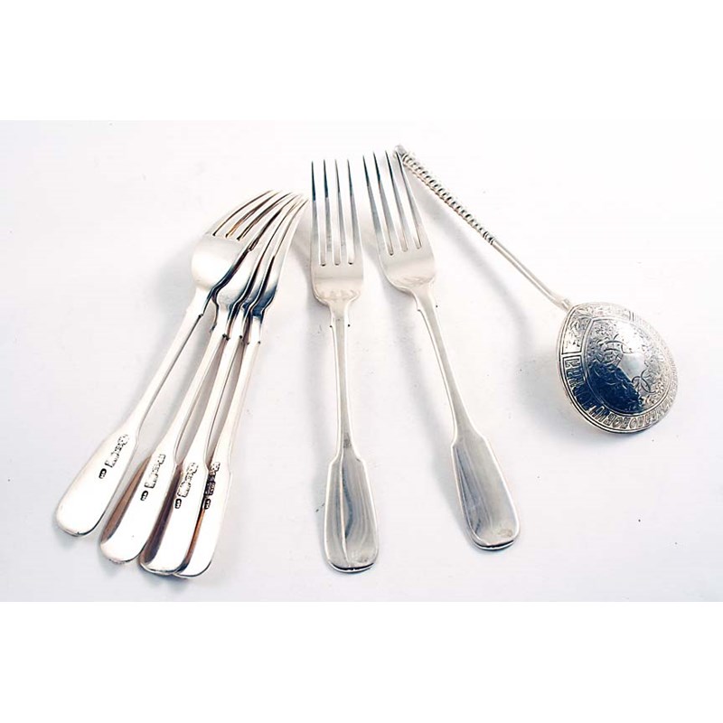 A SET OF SIX LATE 19TH CENTURY RUSSIAN FIDDLE PATTERN TABLE FORKS by Nicholai Alexeyev, Moscow 1867, and a spoon with a part-twisted stem, engraved on the back of the bowl with flowers and a Cyrillic inscription, by Stepan Levin, Moscow 1889; the latter 7.5" (19 cms) long; 14.6 oz (7)
