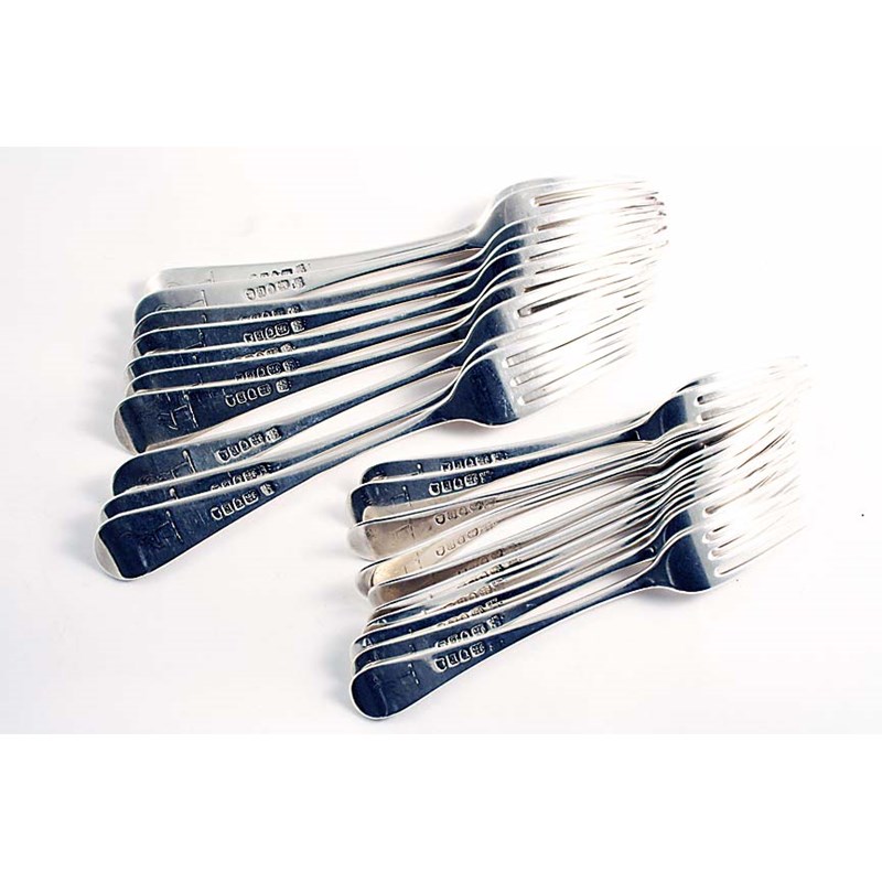 *OLD ENGLISH PATTERN FLATWARE:- A set of ten table forks and ten dessert forks, crested, all by Messrs. Eley & Fearn, London 1800; 33.9 oz (20)