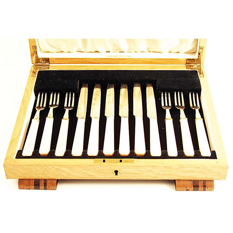 AN ART DECO CASED SET OF SIX PAIRS OF FRUIT/DESSERT KNIVES & FORKS with simulated ivory handles, maker's mark "GH", Sheffield 1935; the case 11.4" (29 cms) long