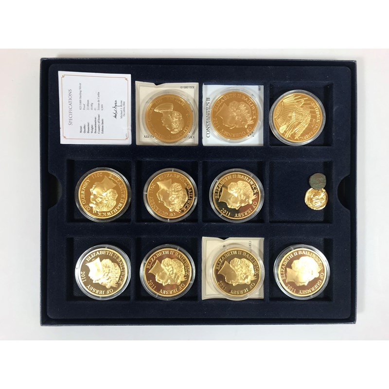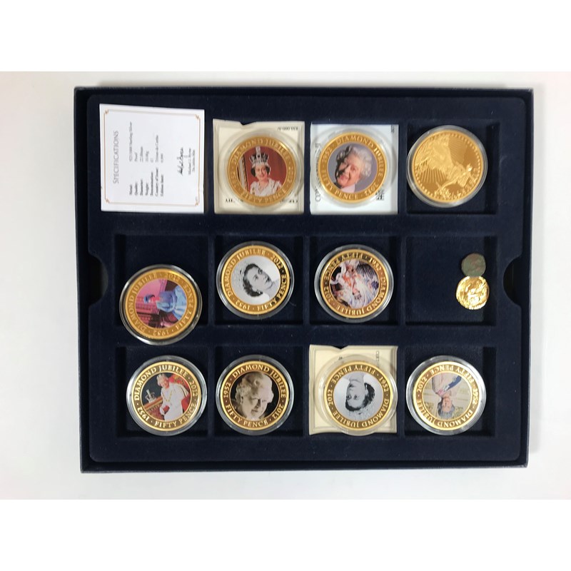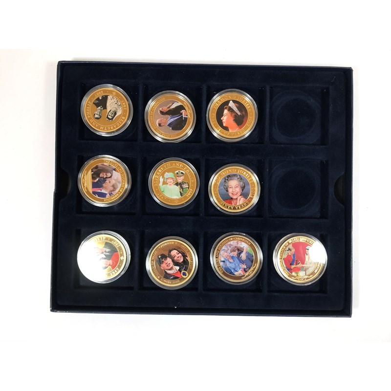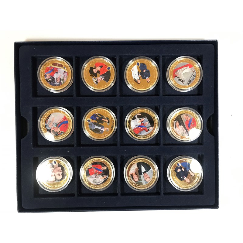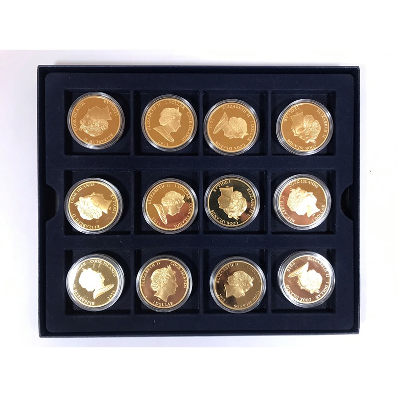 A collection of thirty one pictorial gilt metal coins. Twenty Two 'Cook Islands' with images of Prince William and Princess Catherine, in three Westminster coin trays and a single Cook Islands Five Dollar coin, gilt with a pictorial portrait of the Queen, 'Sixty Years'.