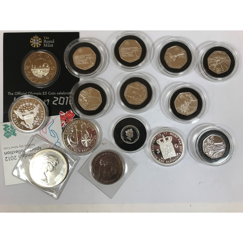 A 2008 BRITANNIA AND OTHER SIMILAR UNCIRCULATED COINAGE. A 2008 Britannia, One ounce fine silver, a London 2012 £5.00 coin and a selection of Olympic 50p pieces and others. 15 coins.