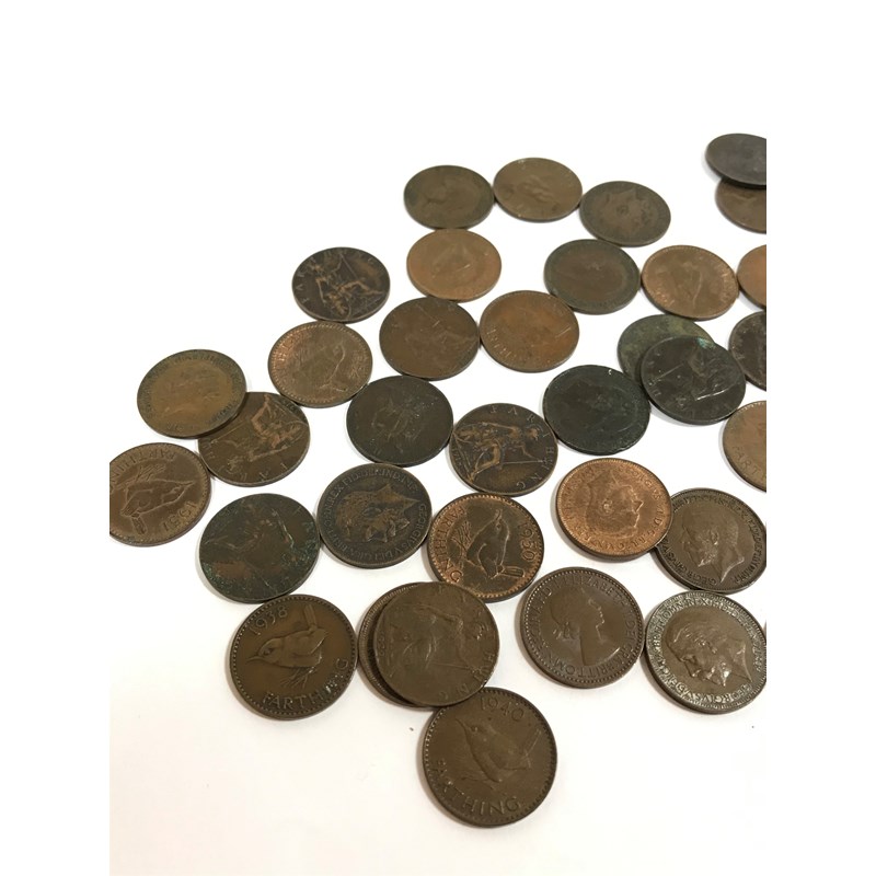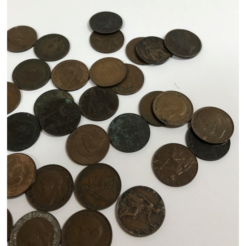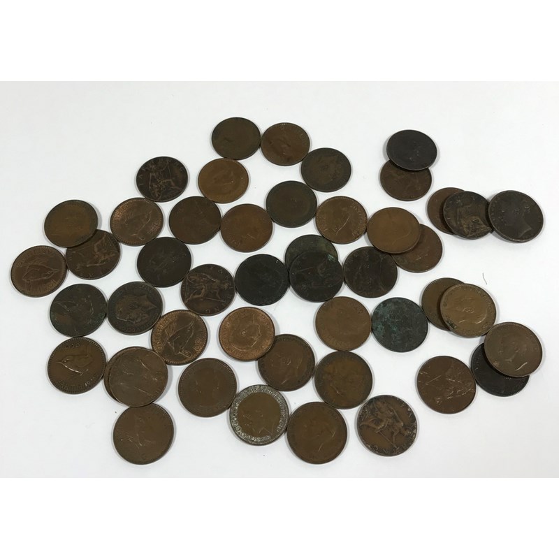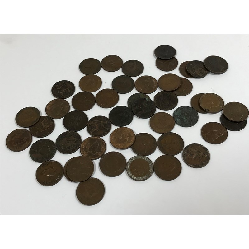 Farthings 1854, 1868, 1881, 1901, 03, 05, 1912, 13, 14, 15, 16, 17, 18, 19, 1920, 21, 22, 23, 24, 25, 26, 28, 29, 1930, 31, 32, 33, 34, 37, 38, 39, 1940, 41, 42, 43, 45, 46, 47, 48, 49, 1951 (2), 52, 53, 54. 47 coins.