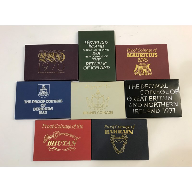 To include coin sets for Brunei 1979, Bhutan 1979, Bahrain 1970, Mauritius 1978, Iceland 1981, Bermuda 1983, Great Britain 1970 and 1971. Eight sets in plastic cases and outer card covers.