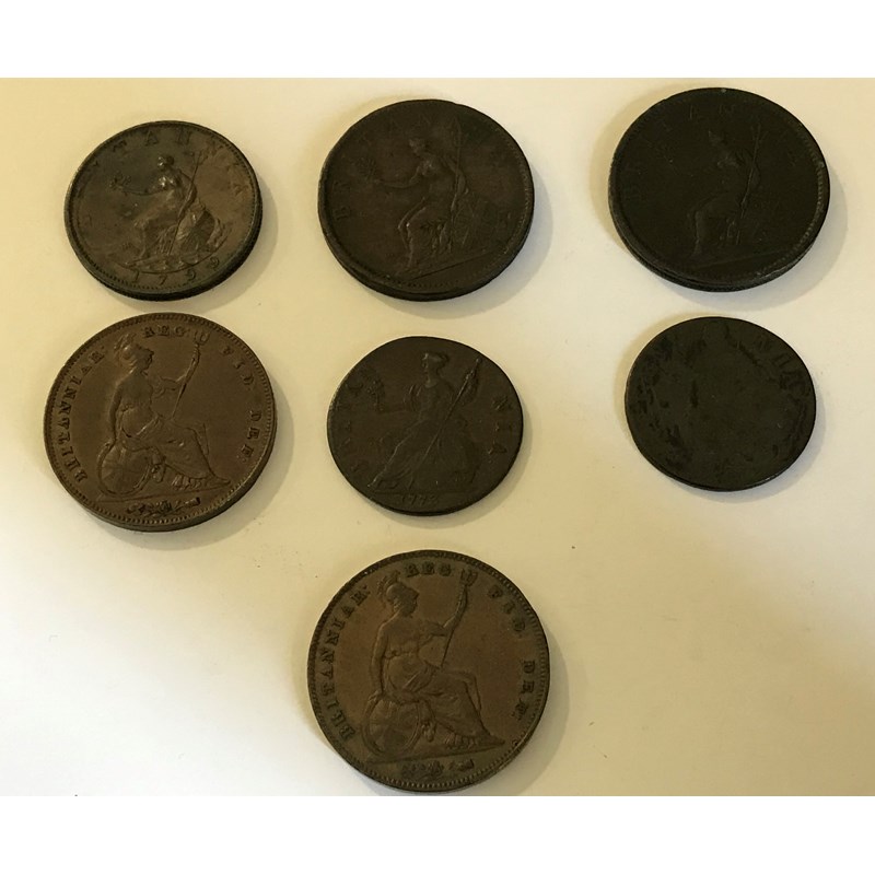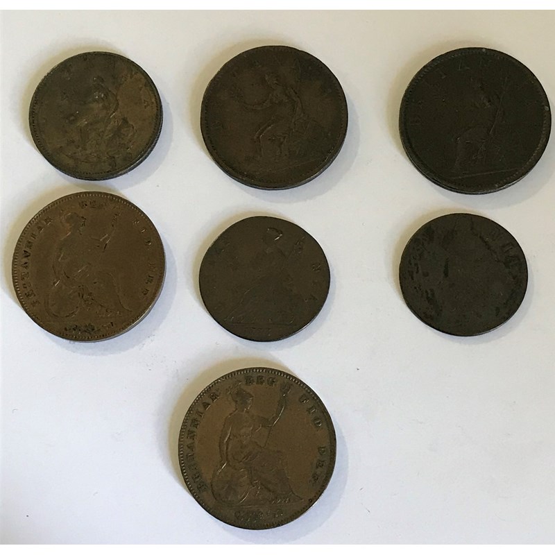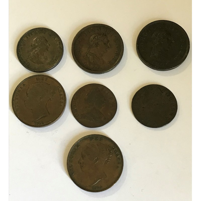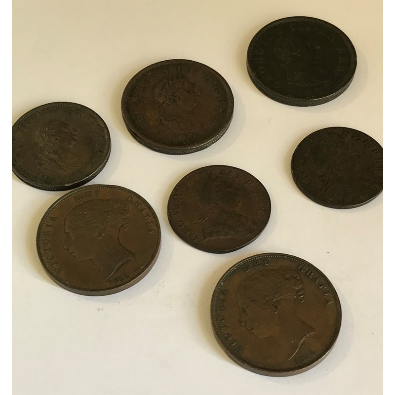 WILLIAM III AND LATER PENNIES AND HALFPENNIES. A William III Halfpenny, date obscured, George III Pennies for 1806 (2) and Halfpennies for 1773 and 1799. Victoria: Pennies for 1854 and 1855. 7 coins.