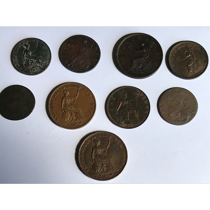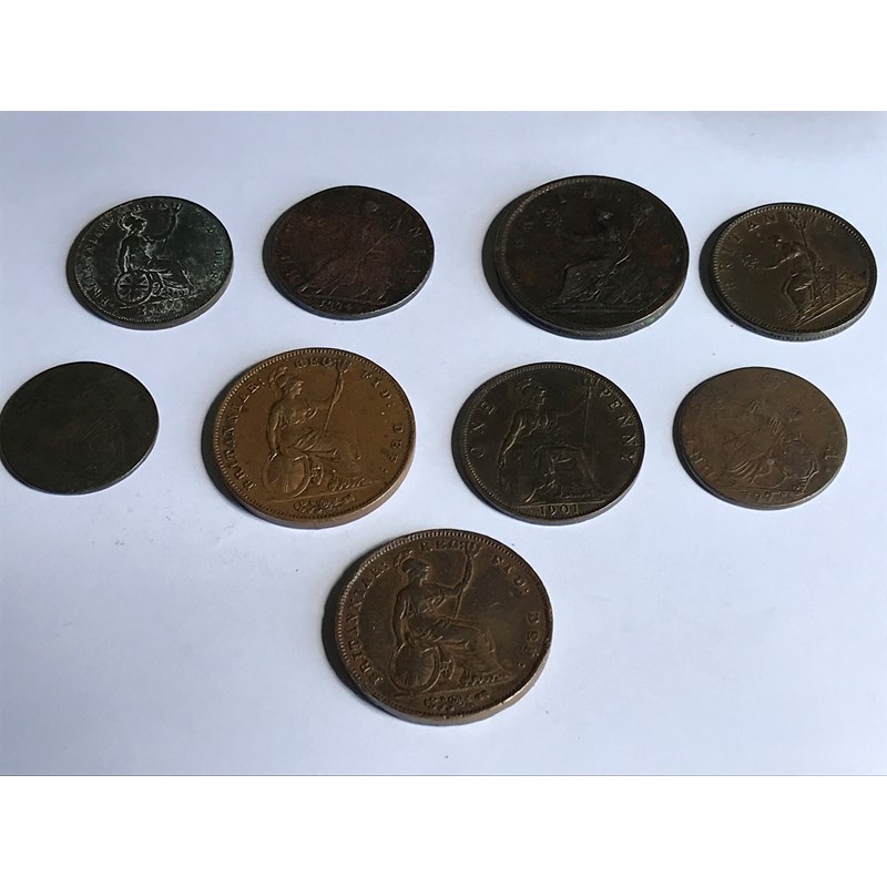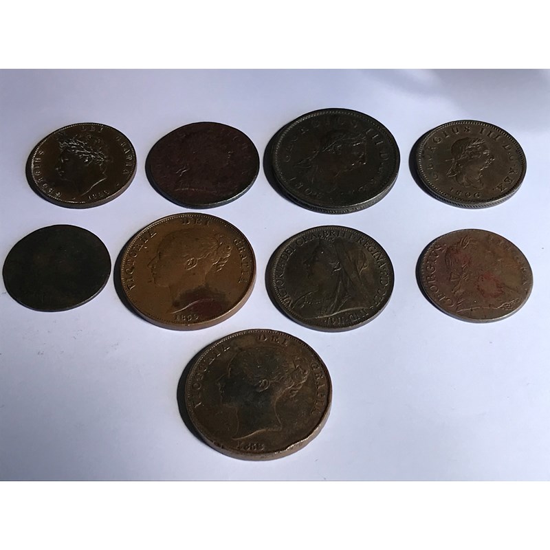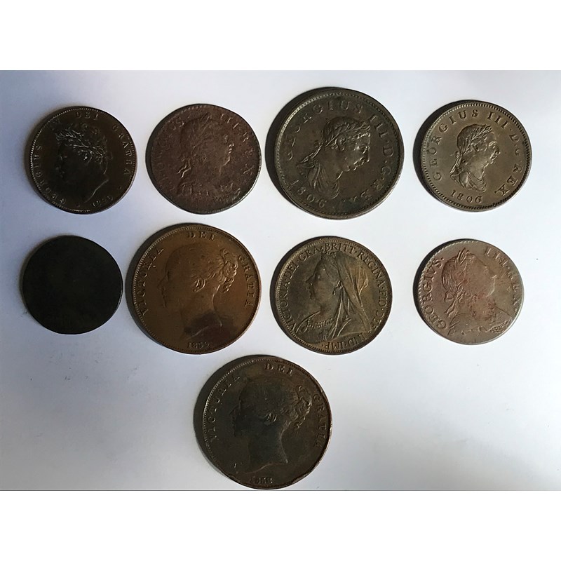 George III Halfpennies for 1774, 1775, 1806 and Penny for 1806. George IV Halfpenny for 1826. Victorian Pennies for 1858, 1859, 1901 and another George III with obscured date. 9 coins.